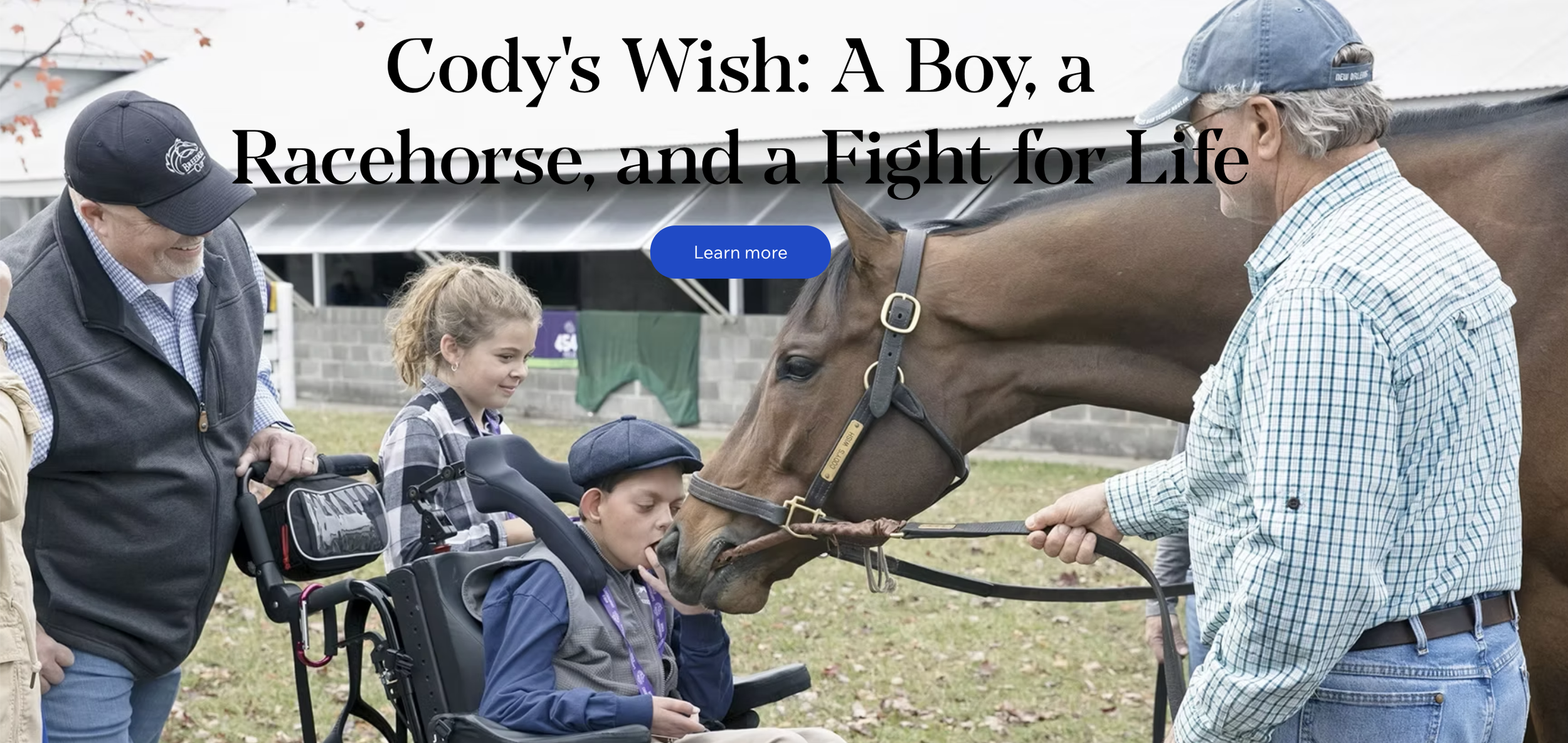 In 2018, through the Make‑A‑Wish Foundation’s partnership with Keeneland, Cody visited Godolphin’s Gainsborough Farm in Versailles, Kentucky. There, he met a young foal that would become Cody’s Wish. In a moment witnessed by farm staff and Cody’s family, the foal walked up to Cody’s wheelchair and gently rested his head in Cody’s lap — a rare and immediate connection that no one present would ever forget.